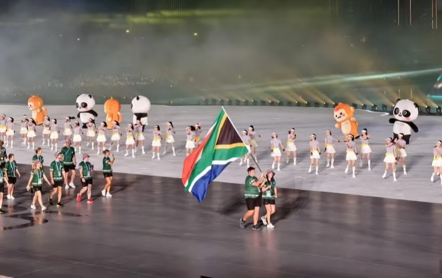 吉祥物“蜀寶”和“錦仔”引領(lǐng)各國運動員入場。吉祥物以大熊貓和川金絲猴為原型,命名以“蜀錦”為靈感。此外,吉祥物的設(shè)計傳達了巴蜀文化意蘊,成都的芙蓉花瓣演繹大熊貓的內(nèi)耳;三星堆出土文物幻化成川金絲猴的耳朵;蜀錦的質(zhì)感與綠水青山融合,編織成吉祥物的服飾;太陽神鳥紋樣則成為服飾上的圖案。